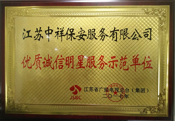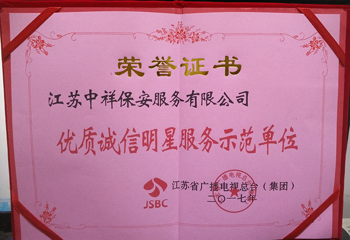 中祥保安公司榮獲江蘇省廣播電視總臺(tái)2017年優(yōu)質(zhì)誠信明星服務(wù)示范單位